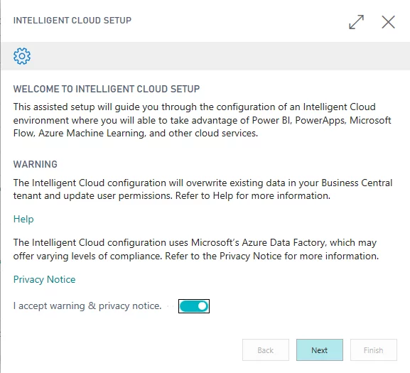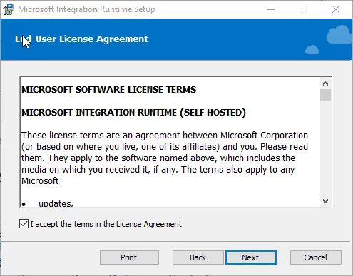 4. In the Intelligent Cloud Setup window, accept the terms, and then select next.