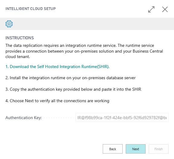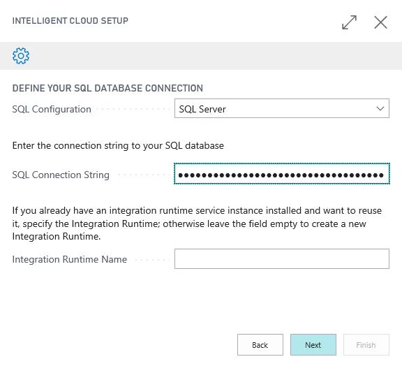 - Integration Runtime Name: If your SQL connection is SQL Server, you must specify the runtime service that will be used to replicate the data from the defined source to your Business Central cloud tenant. To create a new runtime service, leave the field empty, and then select Next.