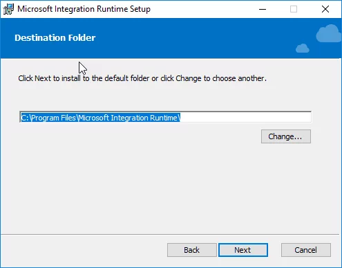12. Select a folder to install the Microsoft Integration Runtime to, and then select Next.