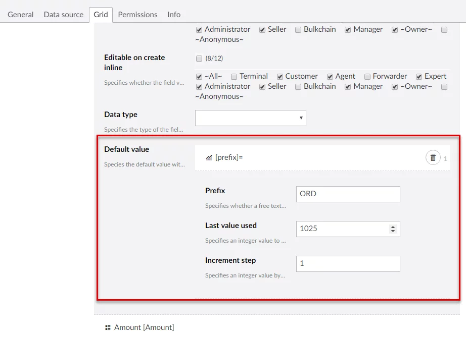 A new option was added to the Default value setting, which allows the portal admin to configure a field on any page to use incremental default value – the value that will be increased by a regular amount according to the configured pattern on each new record with this field. The incremental value may have a prefix, which will be added to each new value if necessary.