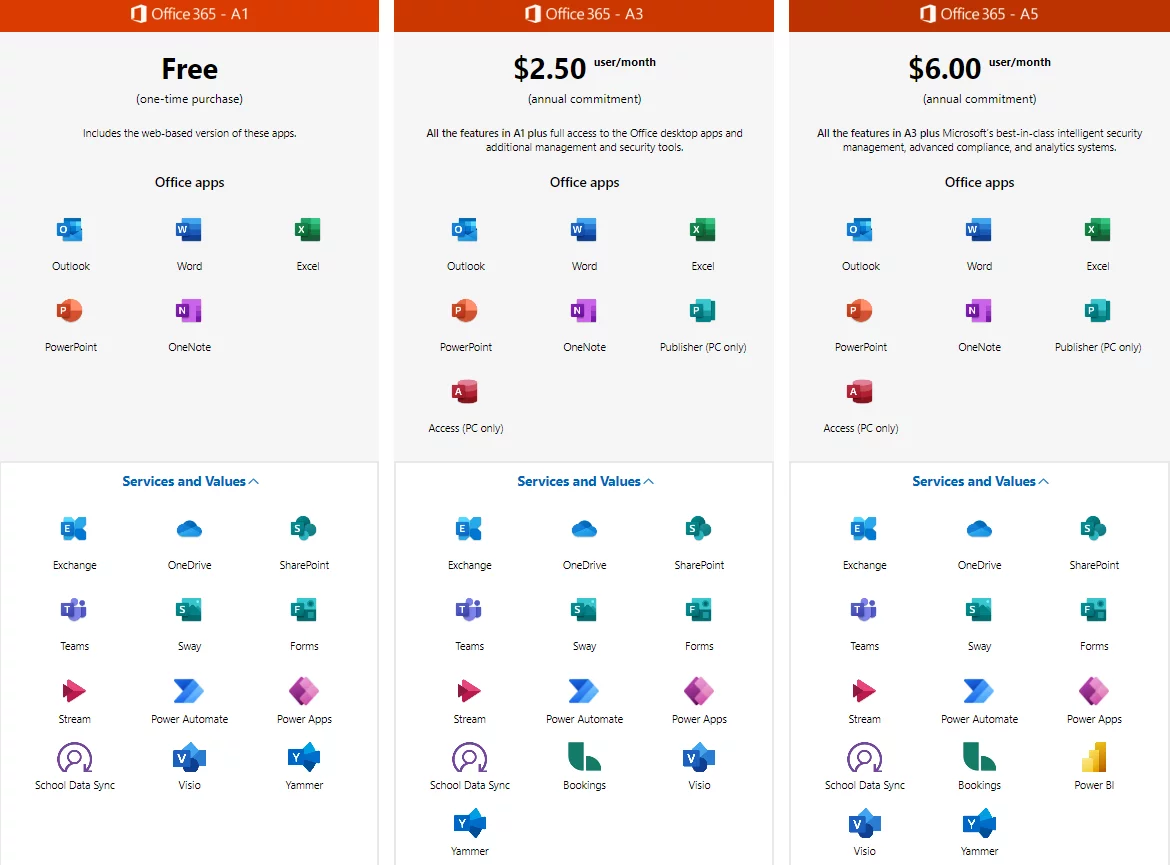Варто відмітити, що існує три рівні Microsoft 365 Education, кожен з яких має цілу низку корисних функцій і, відповідно, варіюється в ціні.