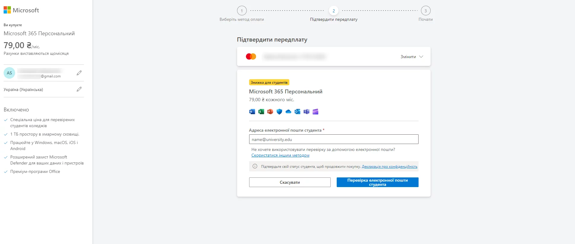 Отримати Microsoft 365 із знижкою (тариф за 79,00 грн/міс) можна підтвердивши статус студента коледжу або університету: