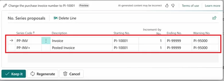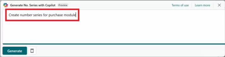 With Copilot’s AI-driven assistance, suggesting number series is now easier than ever. The Generate action opens the Generate No. Series with Copilot dialog, where you can enter a prompt to create new or modify existing, number series.