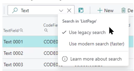 The ability to change the data search method in lists gives users more control over how they search for information in Business Central. Users can switch between the “legacy” search, which searches across all columns, and the “modern” search, which searches only in columns optimized for full-text search matching.