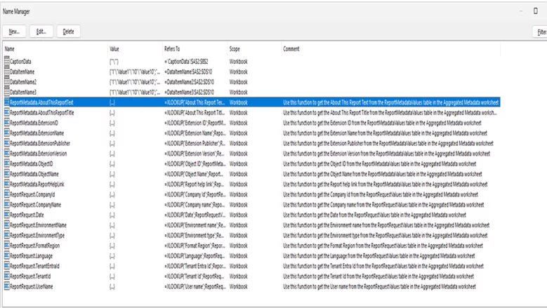 Business Central now supports built-in named formulas in Excel layouts, making it easier to work with and reuse formulas when exporting data to Excel. Named formulas allow users to create dynamic Excel reports that automatically update when new data is added. This feature simplifies report building, and reduces the time for development of complicated VLOOKUP or XLOOKUP formulas.