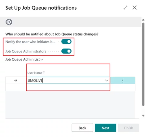 In addition to external notifications, Business Central now offers in-product notifications for issues related to job queue background processing. This feature ensures that administrators are immediately alerted to any problems directly within the system.