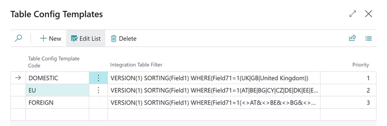 In this release, Business Central introduces the ability to auto-apply templates when synchronizing data with Dataverse. For example, when you synchronize account data from Dataverse to the customer table in Business Central, you might want to apply different configuration templates for domestic or foreign customers. Configuration templates can contain different posting groups and other settings for the customer records that synchronization creates. The synchronization engine chooses a configuration template based on the country specified for the account record in Dataverse.