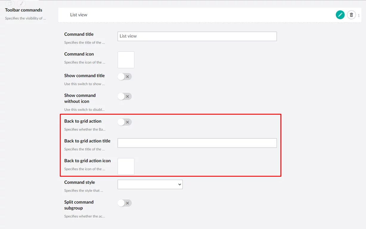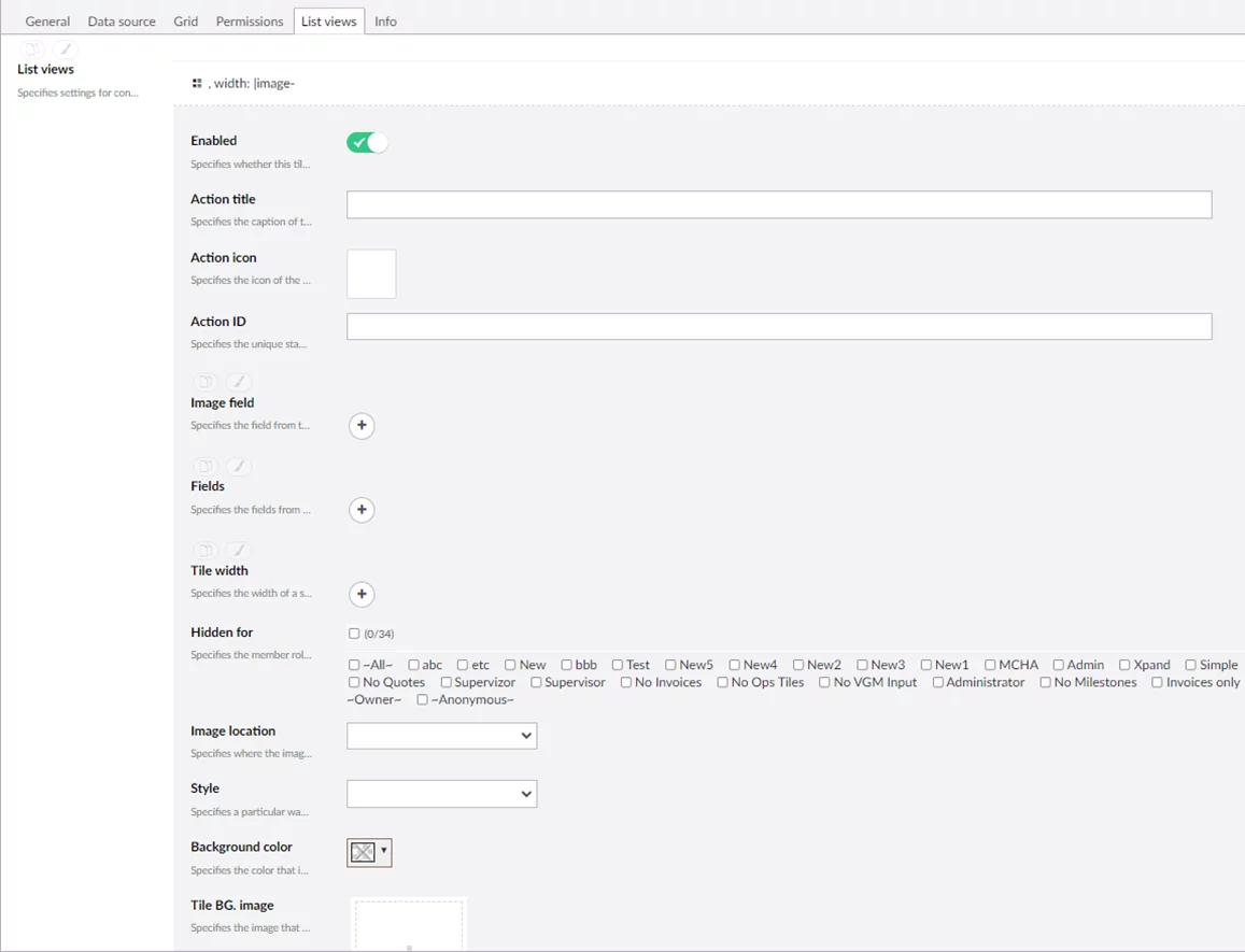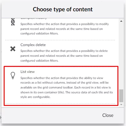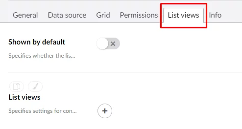 List views – specifies whether the action that provides the ability to view records as a list without columns, instead of the grid view, will be available on the grid command toolbar. Each record in a list view is shown in its own container (tile). The data source of each tile and its style is configurable.