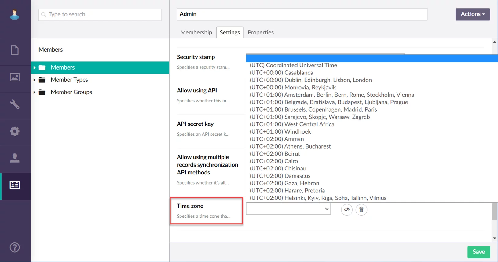 Time zone setting allows you to set up a time zone for the member. The time zone will be used for date and datetime fields on the grid, detail, and notification pages. When it is not configured, the time zone settings from the PC will be applied.