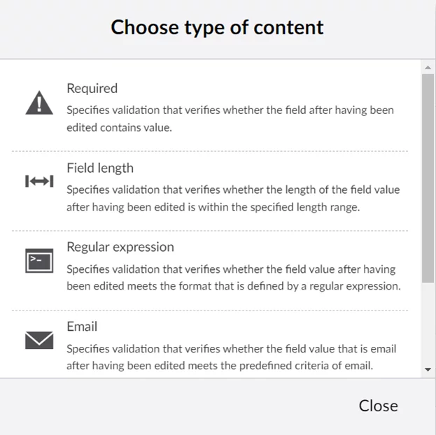 Custom – Verifies whether the field value after having been edited meets those criteria that are defined in a custom script (JavaScript).