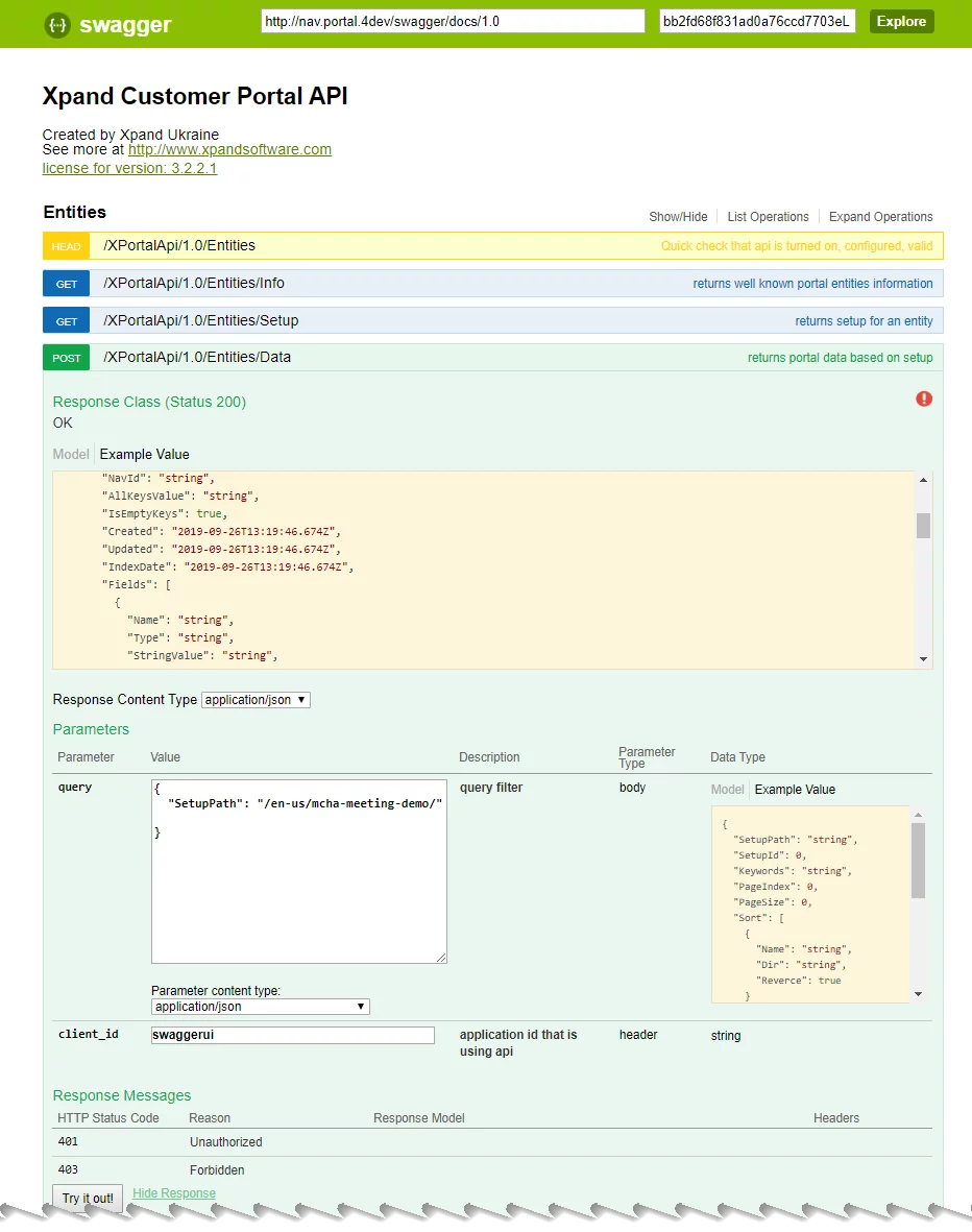 A SWAGGER client is used as an example to visualize interaction with the Xpand Portal API’s resources to retrieve information and data from Xpand Portal.
