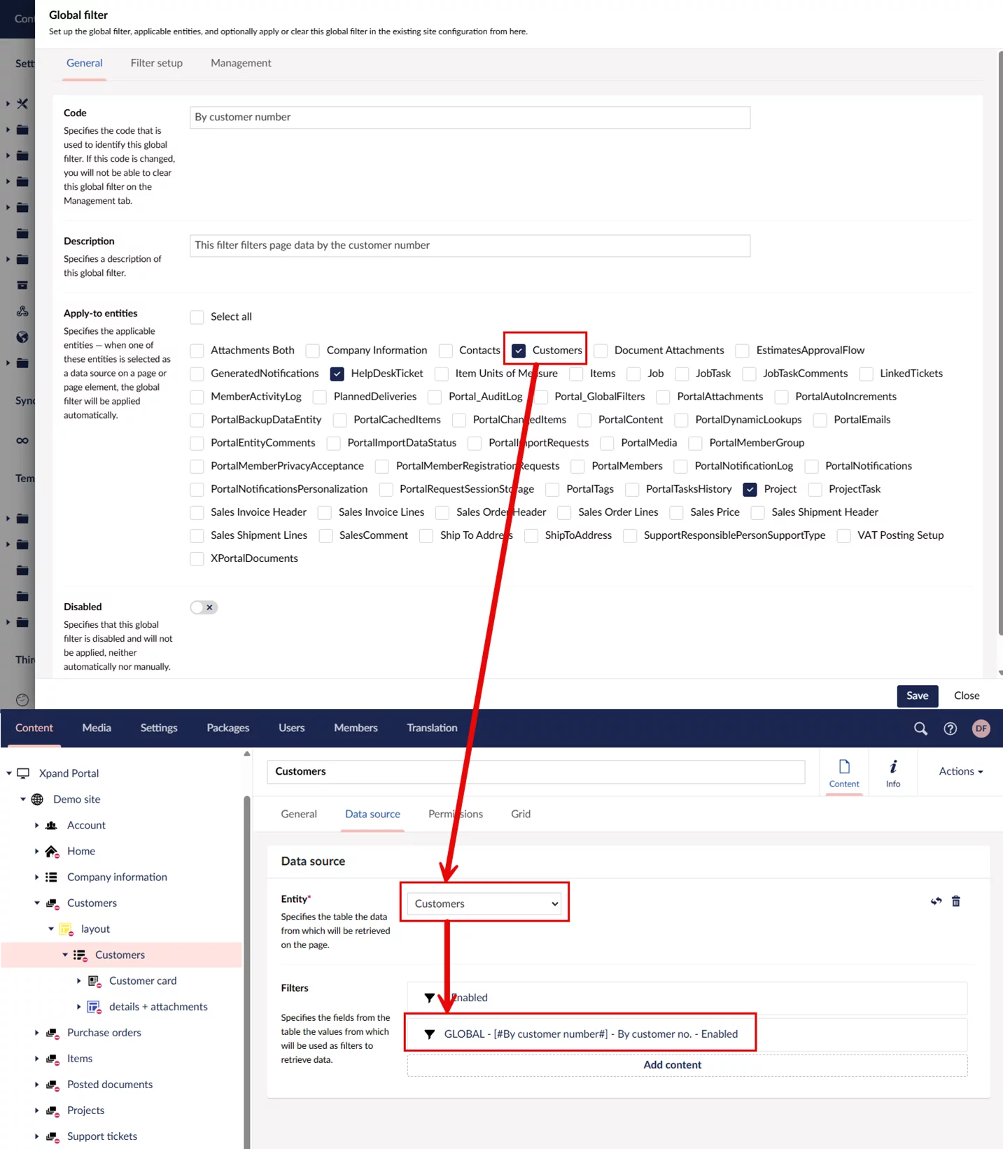 Global filters are data source filters that can be defined once for the entire portal. When you configure a page and select a data source entity that has global filters assigned, those filters are automatically added to the page.