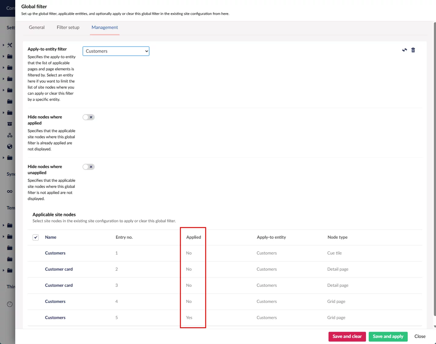 In the global filter settings, you can also manage global filters in the existing configurations by applying or clearing global filters on previously configured pages or page parts.