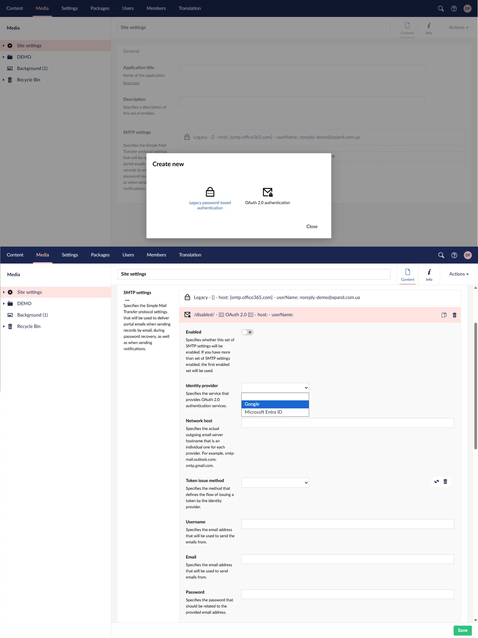Sending emails from Xpand Portal is now more secure. In addition to the traditional password-based method, you can now use modern OAuth 2.0 authentication for safer connection. Configure Google or Microsoft Entra ID as your identity provider — or, as part of customization, connect any other provider.