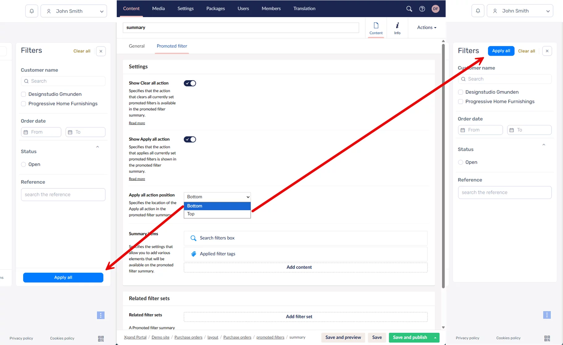 In promoted filters, we added the option to choose the position of the Apply all action (top or bottom) in the filter summary pane as well as revised the behavior of certain promoted filter settings.