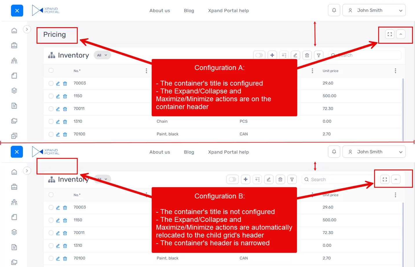 - Configuration B: The page container does not have a title. In this case, to avoid having a large empty area, the Expand/Collapse and/or Maximize/Minimize actions are automatically moved to the grid header below.