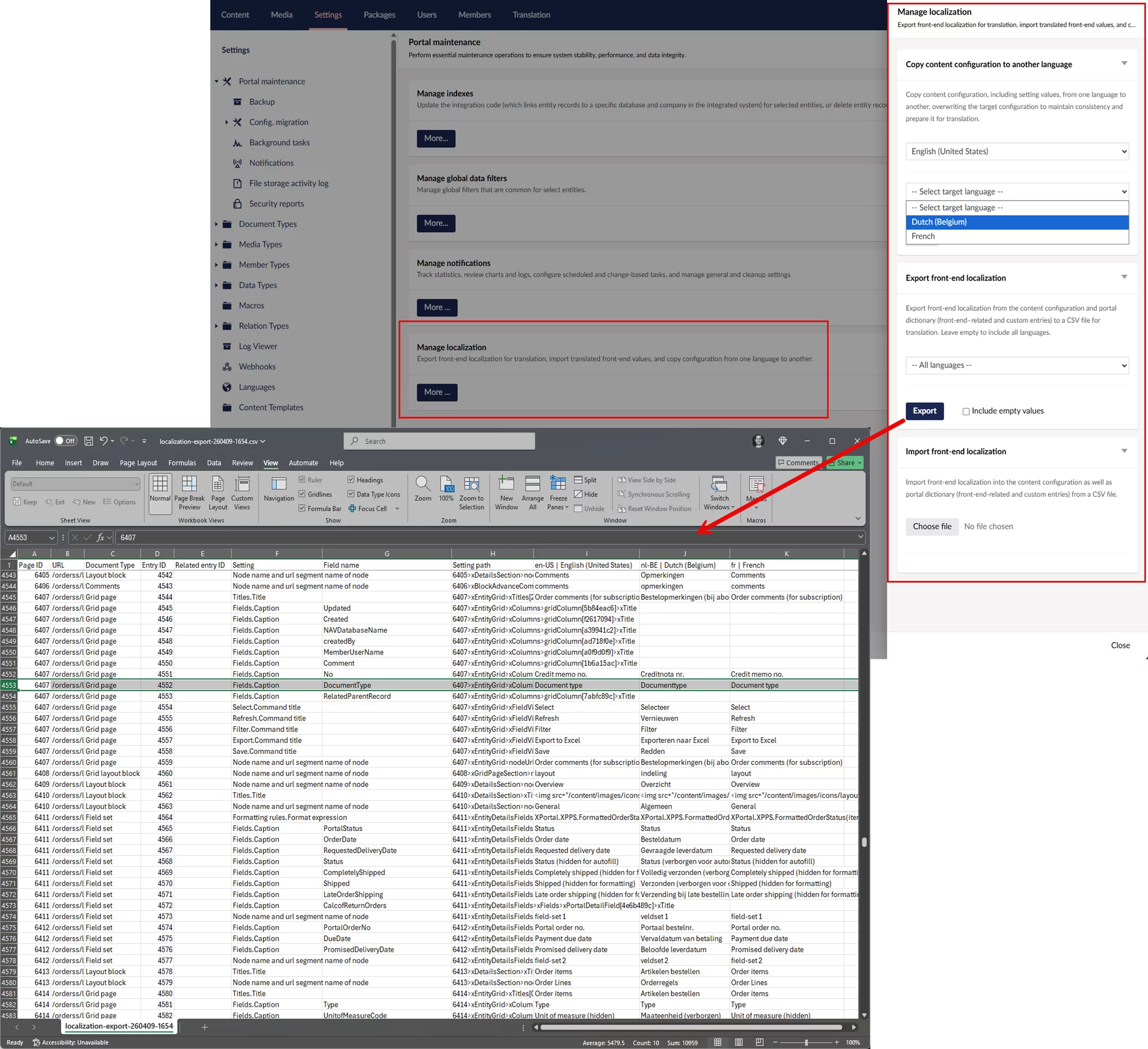 Copy the full site configuration from one language to another, overwriting the target configuration, including setting values. This allows you to quickly align languages and use the copied setup as a consistent basis for translation. - Export front-end localization to CSV and import translated values back into the portal