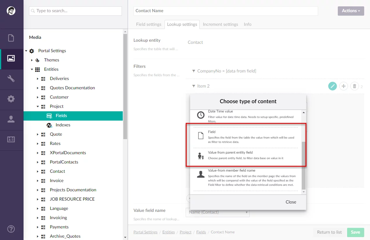 Filtering capabilities for lookup fields have been enhanced. Now you can add a filter by a field value from the current entity, to which the field belongs, or from a specific portal entity of your choice.