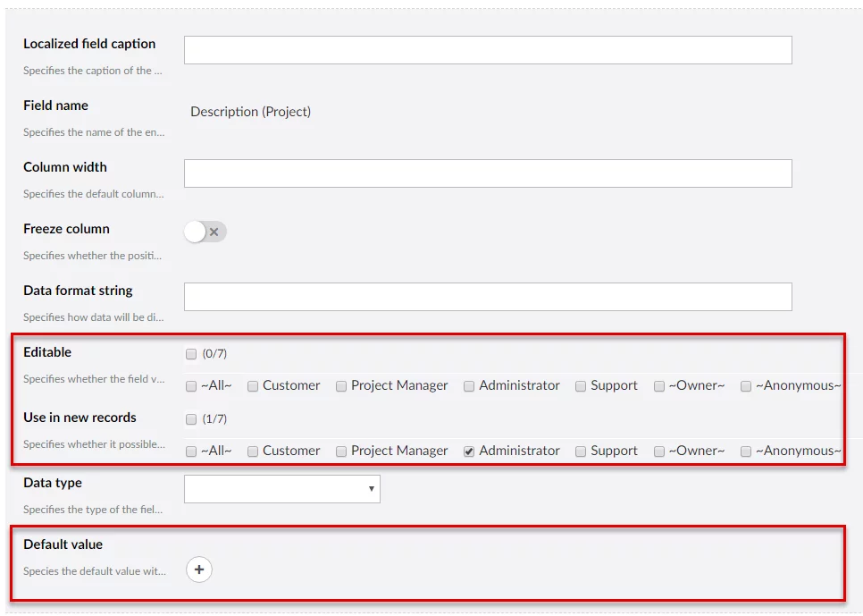 - Use in new records - Specifies whether it will be allowed to edit the field value when creating a new record with this field and for which member groups.