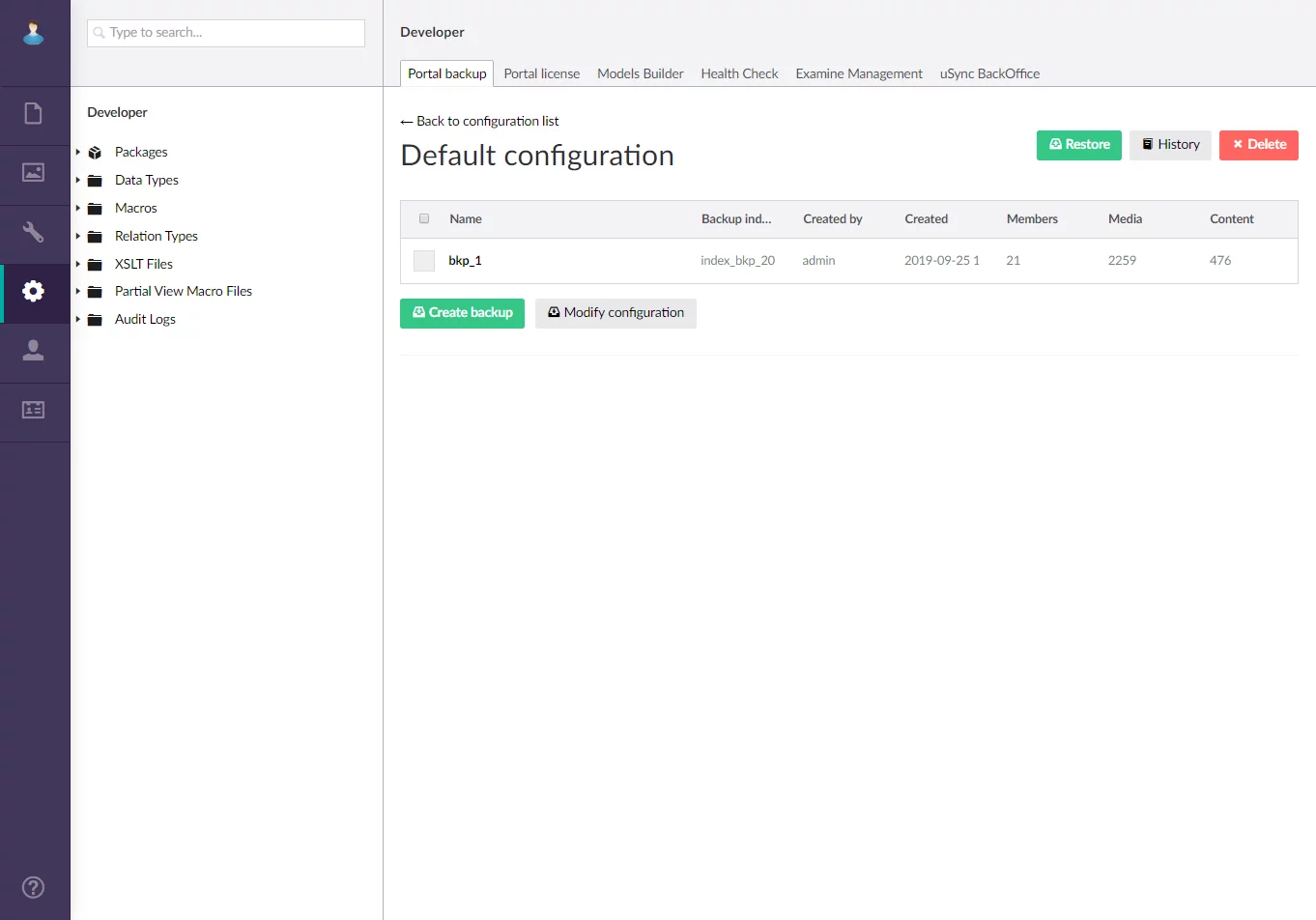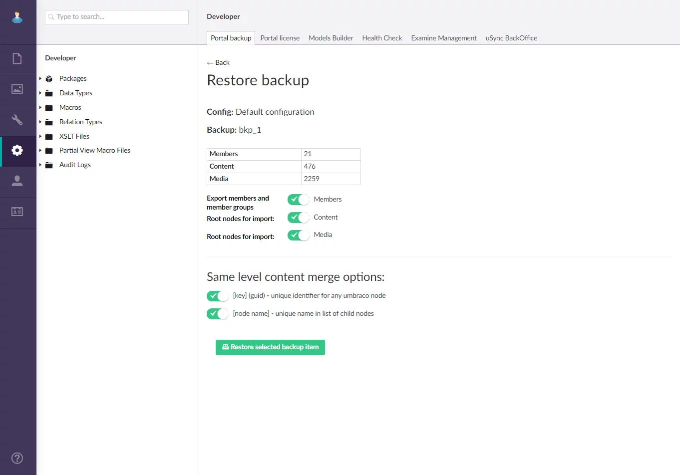 Additionally, Xpand Portal allows merging and expanding configuration when you are restoring configuration from a backup file. Therefore, you can choose how to merge imported data when restoring configuration, in case the configuration structure does not fully coincide: you can choose to overwrite an existing back-end page with a page from the backup file only in case its ID is the same, or its node name is the same, or both its ID and node name are the same as in the backup file.
