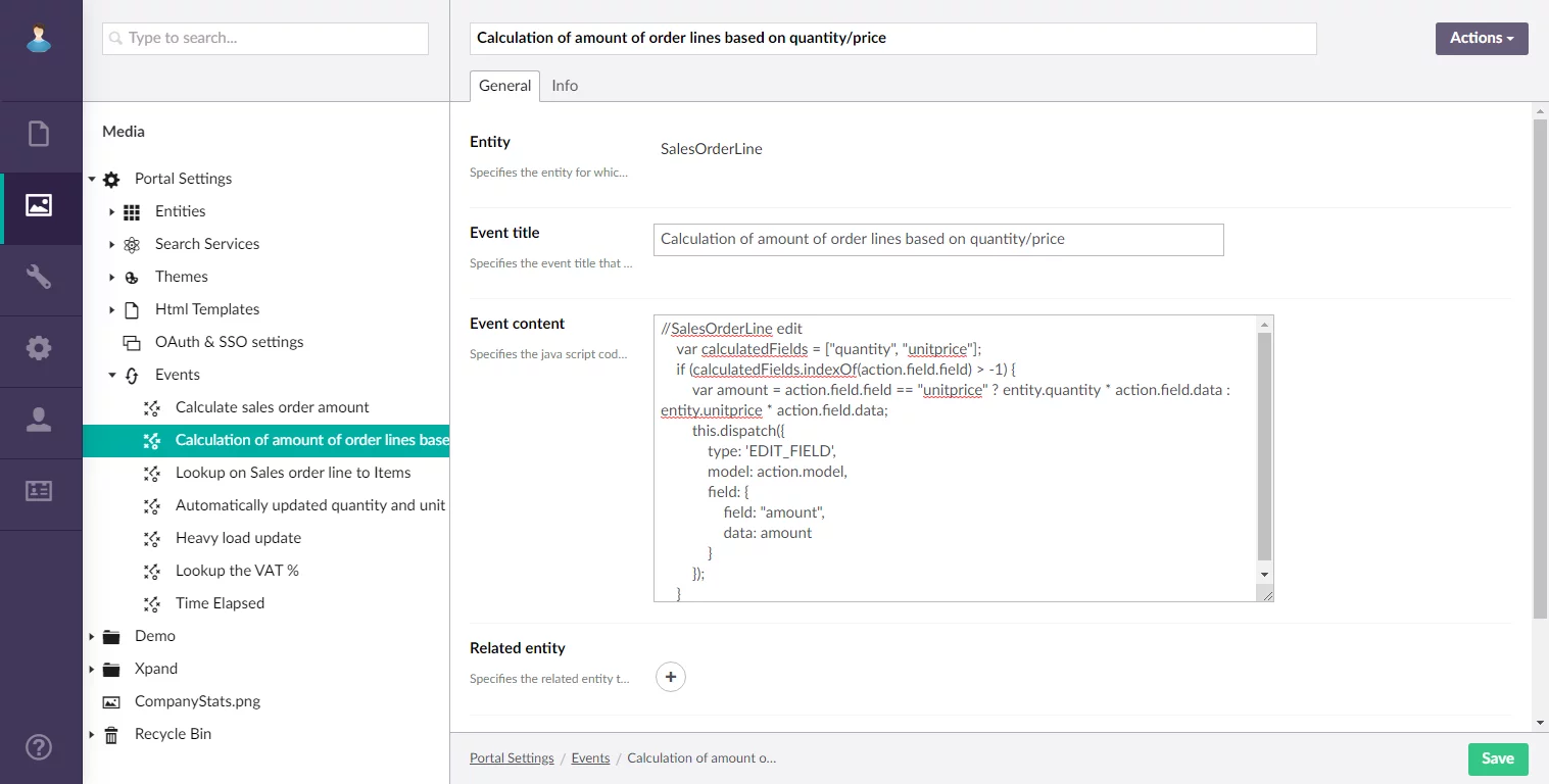 For advanced users, the possibility to add events, based on JavaScript code, was added. This feature allows you to implement various automatic events on your portal. For example, you can add dependencies between fields on records so that a field value is automatically calculated or automatically retrieved from a related grid when another field(s) is filled in or when a certain condition is met.