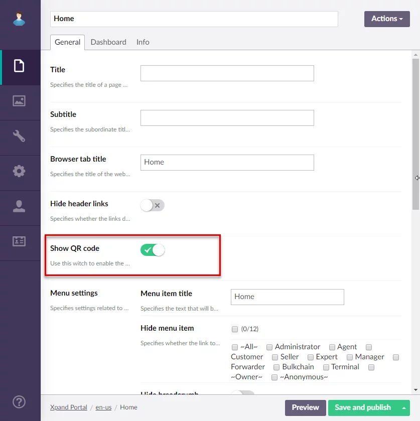 A new setting, Show QR code, was added to the dashboard, grid, detail, and simple content page.