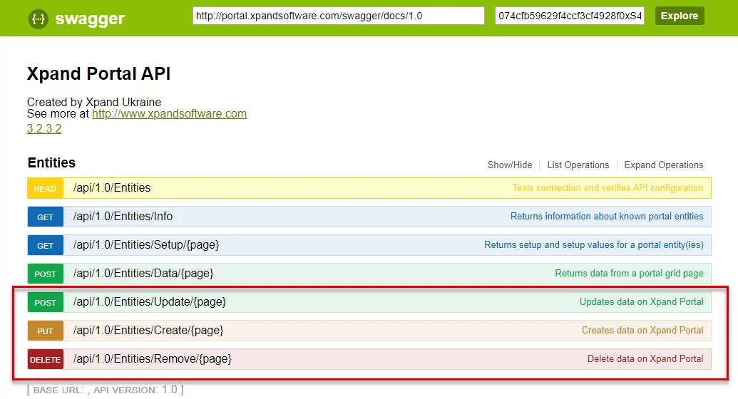DELETE: /api/1.0/Entities/Remove/{page} – provides you with the possibility to create data on Xpand Portal through Xpand Portal API.