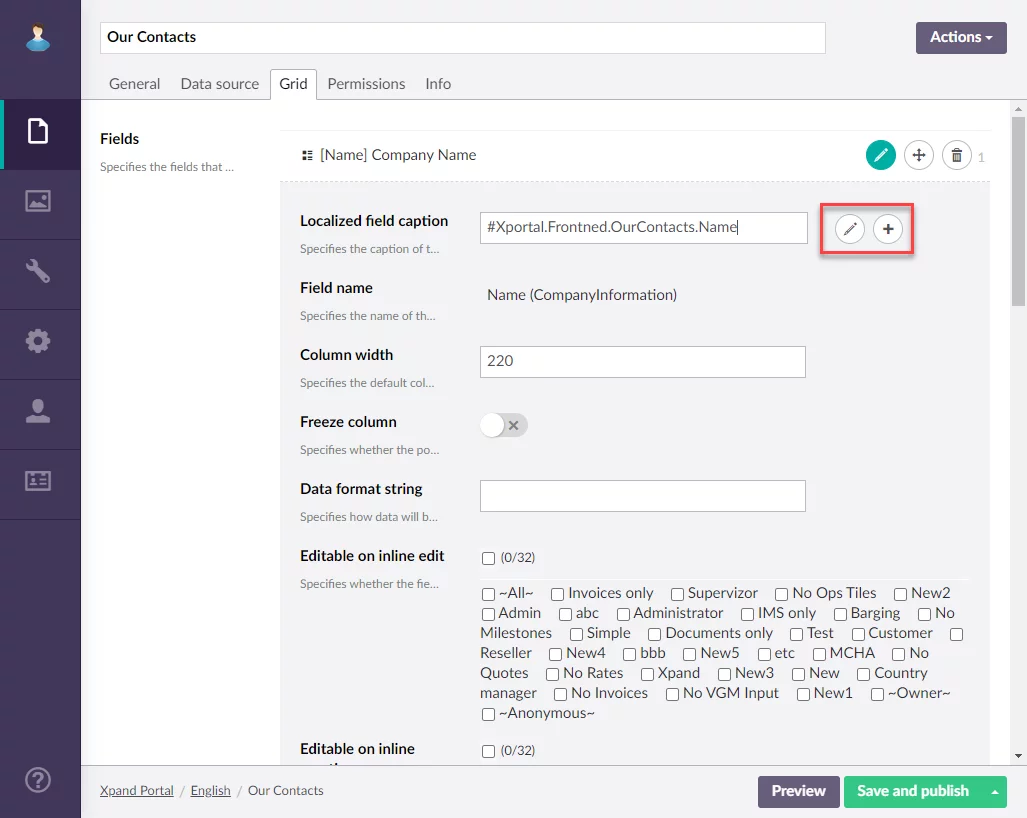 Previously, to configure captions for multiple localizations, you had to create separate nodes with the same pages per localization. This process has been improved. Now you can configure localized captions for pages, fields, and other page elements within a single localization node. To do this, you need to specify caption, you specify its dictionary code instead, starting with #XPortal.Frontend. This enables additional controls that allow you to either create a new dictionary item with all localization captions that you need for this page element or edit an existing one.